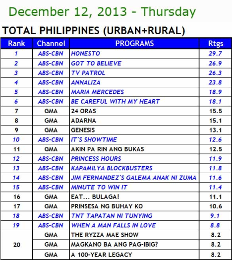 ABS-CBN got 8 out of the top 10 programs on Wednesday, December 11 according to the data provide by Kantar Media/TNS. Included in the top 6 programs are Honesto, Got to Believe, TV Patrol, Annaliza, Maria Mercdes and Be Careful with My Heart.